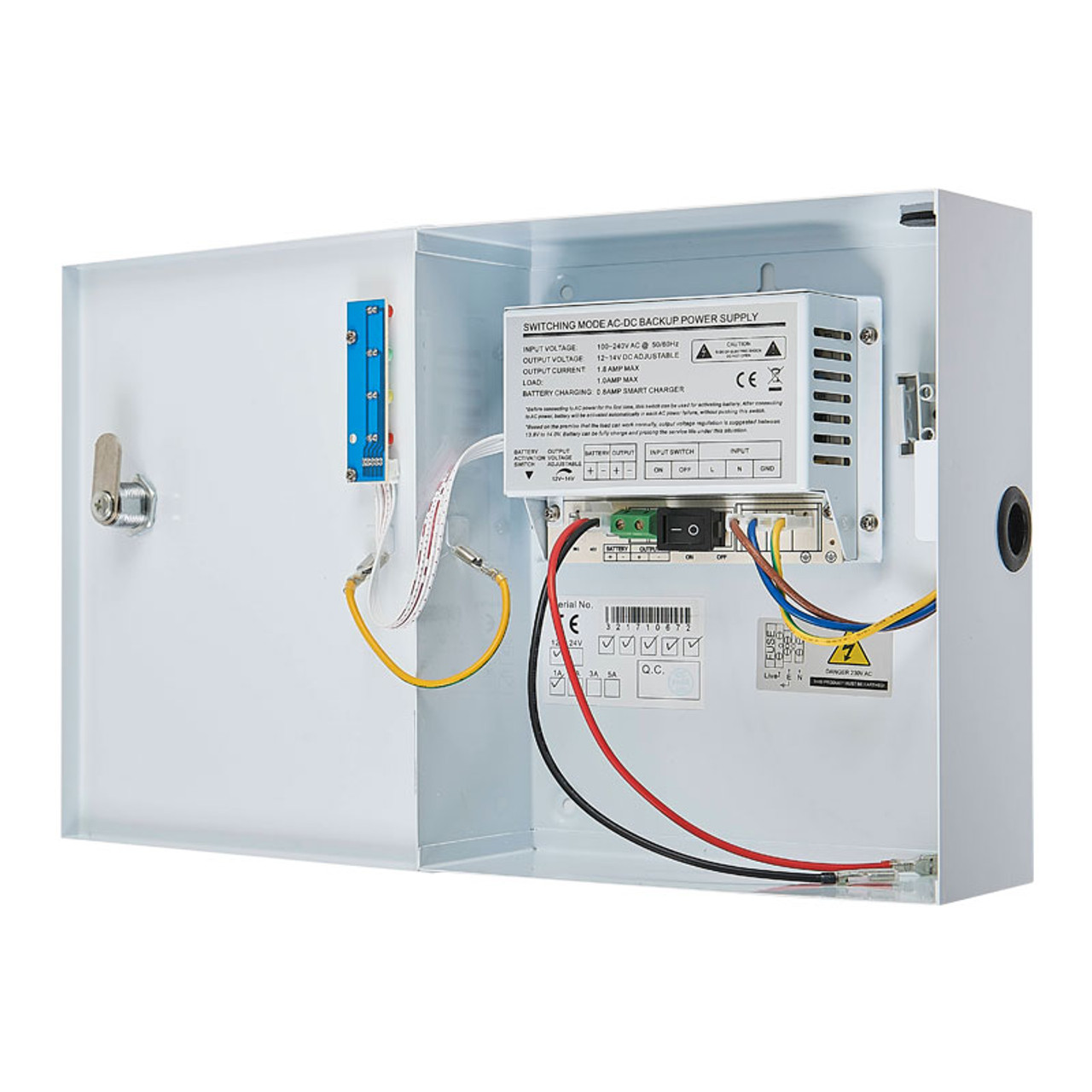 This boxed power supply provides a 12Vdc output for powering access control products such as keypads, maglocks, electric releases, solenoid bolts, etc. Housed in a lockable metal cabinet with status indicator LEDs, its battery back-up feature enables continuous power during mains failures when fitted with an optional lead-acid battery.